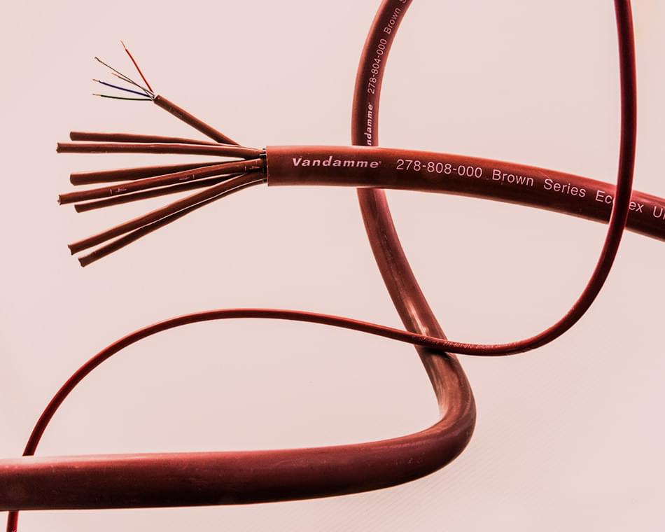 Van Damme Brown Series Ecoflex to bezhalogenowy przewód w powłoce LSZH (Low Smoke Zero Halogen) z ekranem foliowym, dostępny w wersji pojedynczej typu quad oraz jako kabel wieloparowy o konstrukcji starquad, stworzony przede wszystkim z myślą o rynku instalacyjnym. Ponieważ jest to kabel dedykowany do instalacji stałych, zastosowano w nim ekran z folii zamiast miedzianego oplotu – w tego typu zastosowaniach przewód nie musi bowiem radzić sobie z dynamicznym zginaniem.