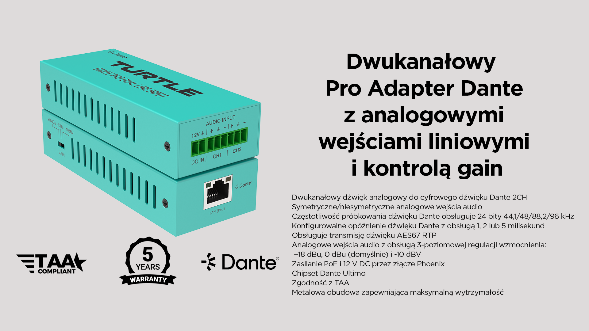 Turtle z dumą oferuje 5-letnią gwarancję na nasze urządzenia Dante Pro. Gwarancja trwa 5 lat od daty zakupu, a my jesteśmy również dumni, że oferujemy bezproblemową gwarancję wymiany z wyprzedzeniem na wszystkie nasze produkty.