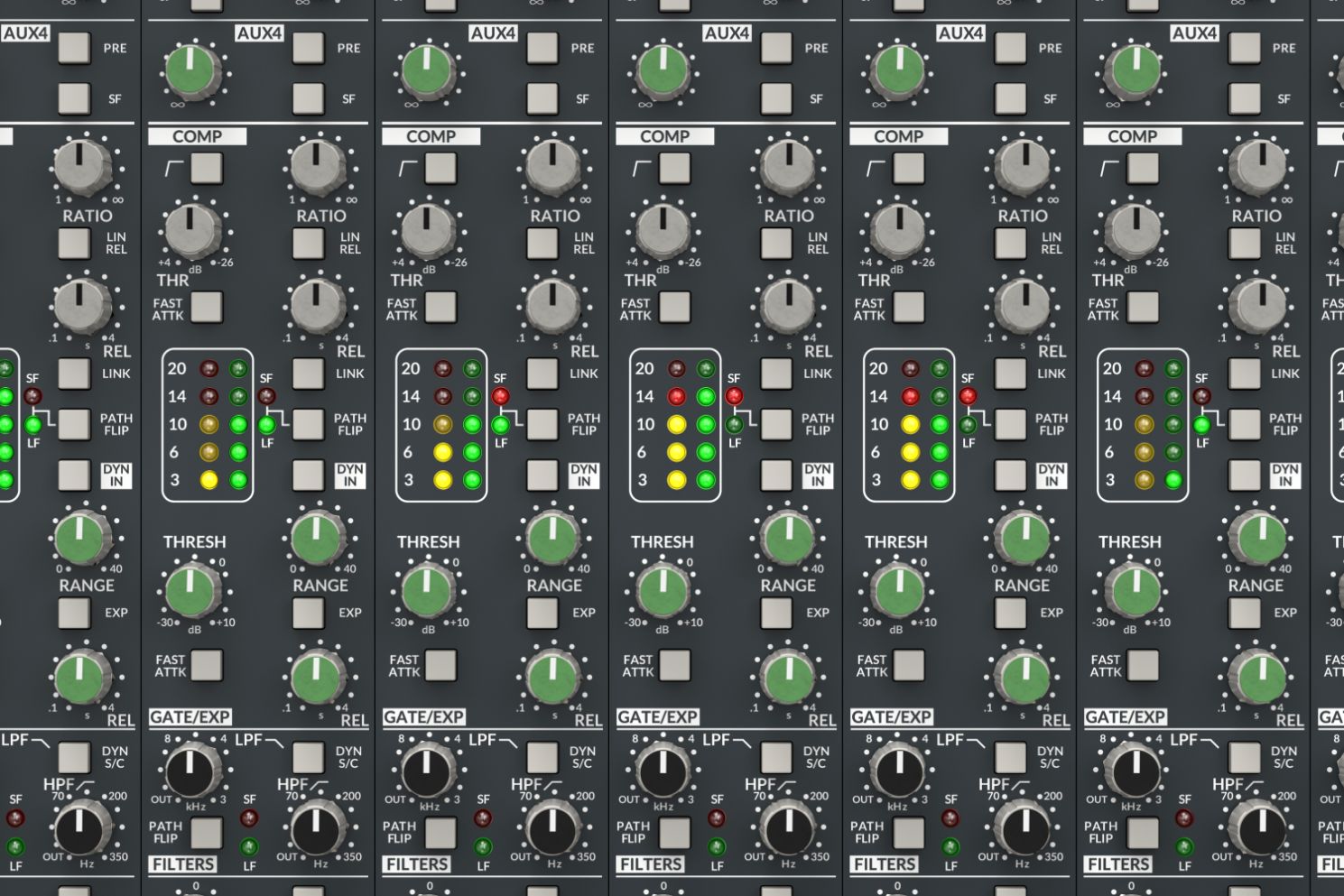 Każdy kompresor posiada funkcję LINK, która przekazuje sygnał sidechain do sąsiednich kanałów, umożliwiając ich połączenie. Sekcja dynamiki ORIGIN EVO wyposażona jest w detektor sidechain true RMS oraz całkowicie dyskretny stopień redukcji wzmocnienia, identyczny z układem VCA klasy A zastosowanym w oryginalnej konsoli. Elastyczne regulatory pozwalają ominąć krzywą soft-knee, włączyć szybki atak i wybrać logarytmiczny lub liniowy release – zapewniając trzy charakterystyczne cechy kompresji, które ukształtowały niezliczone kultowe nagrania.